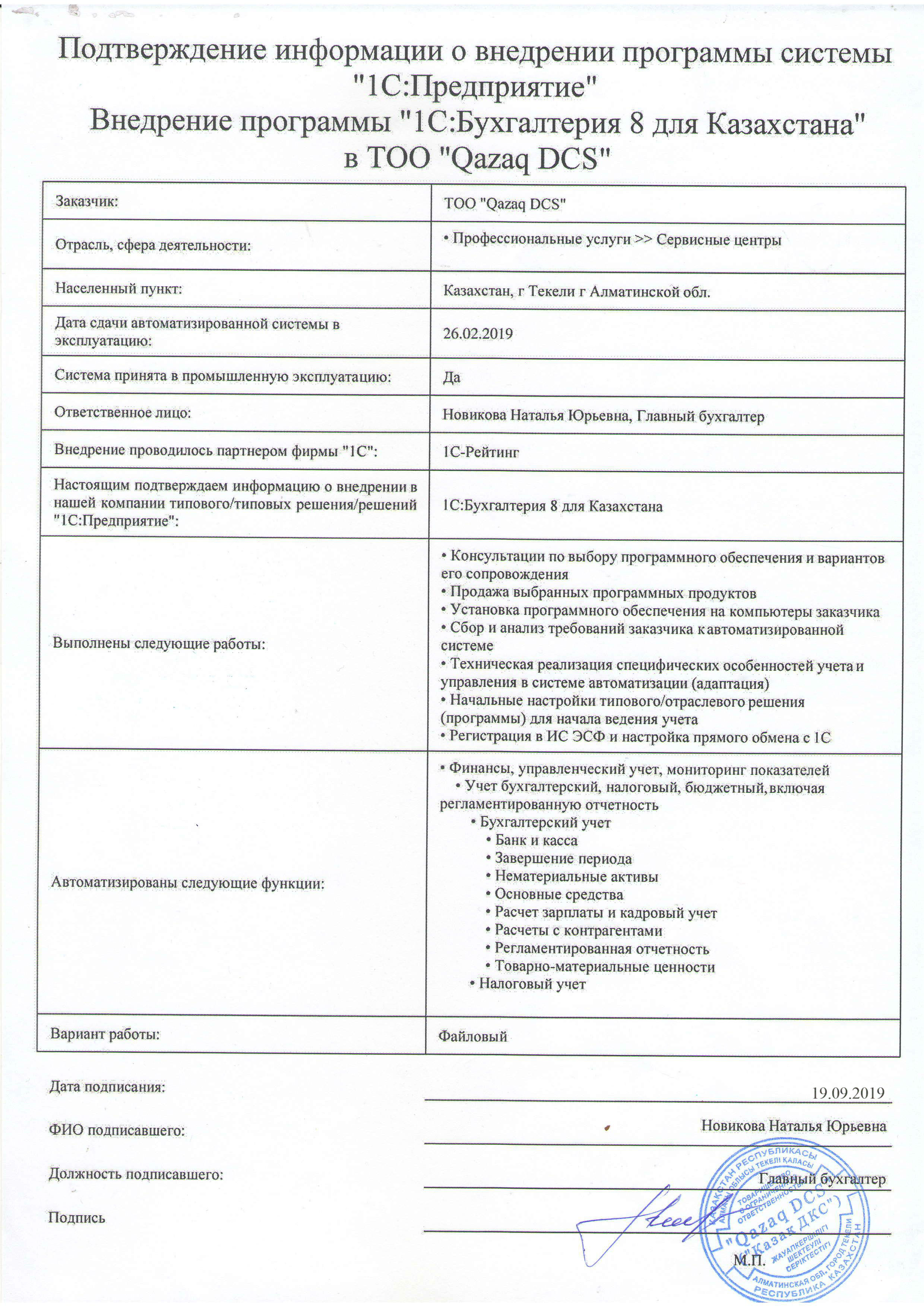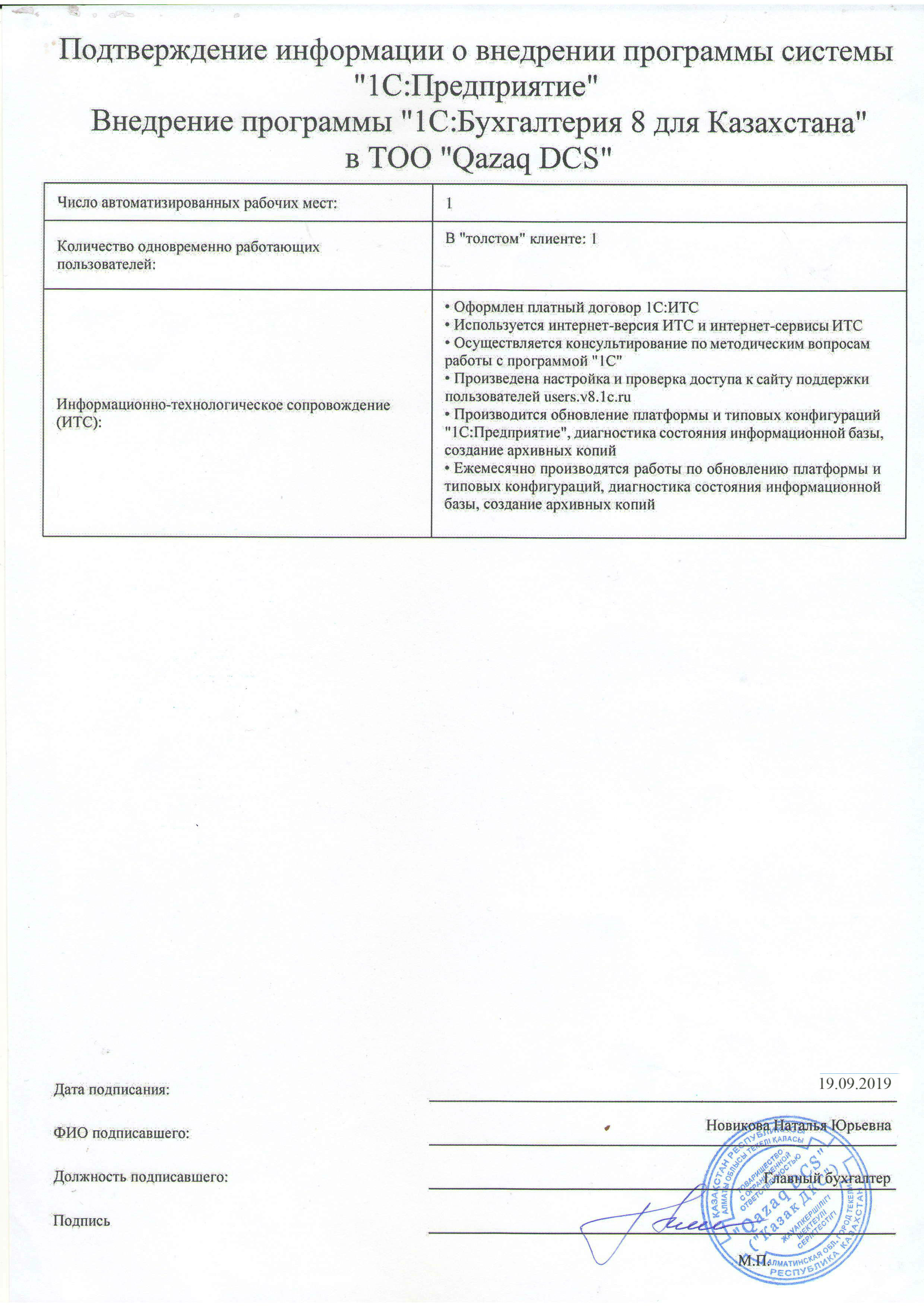 | Внедренное типовое решение: | 1С:Бухгалтерия 8 для Казахстана |