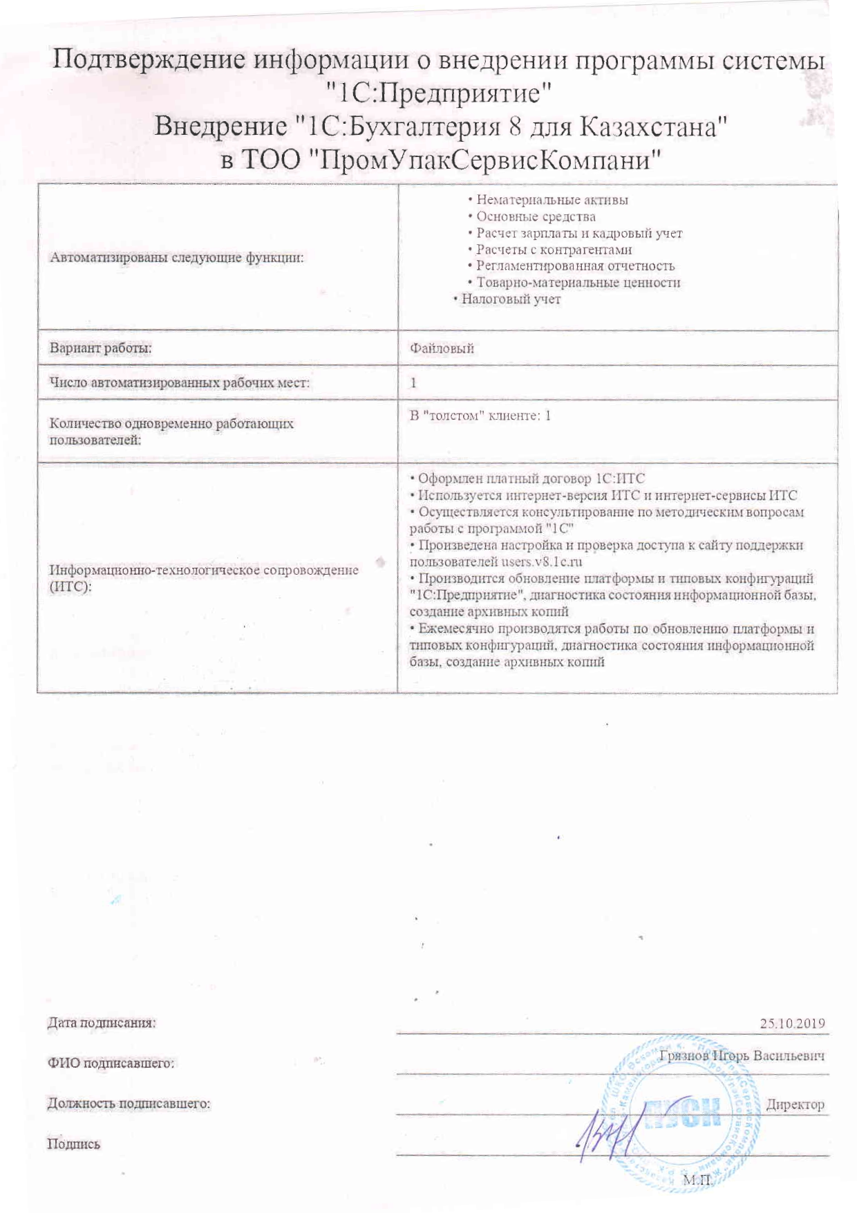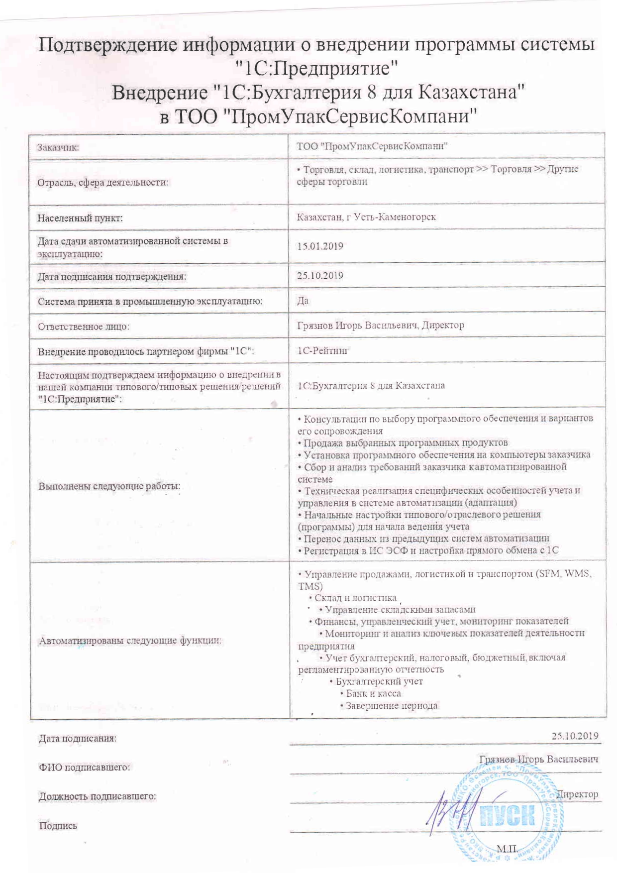 | Внедренное типовое решение: | 1С:Бухгалтерия 8 для Казахстана |