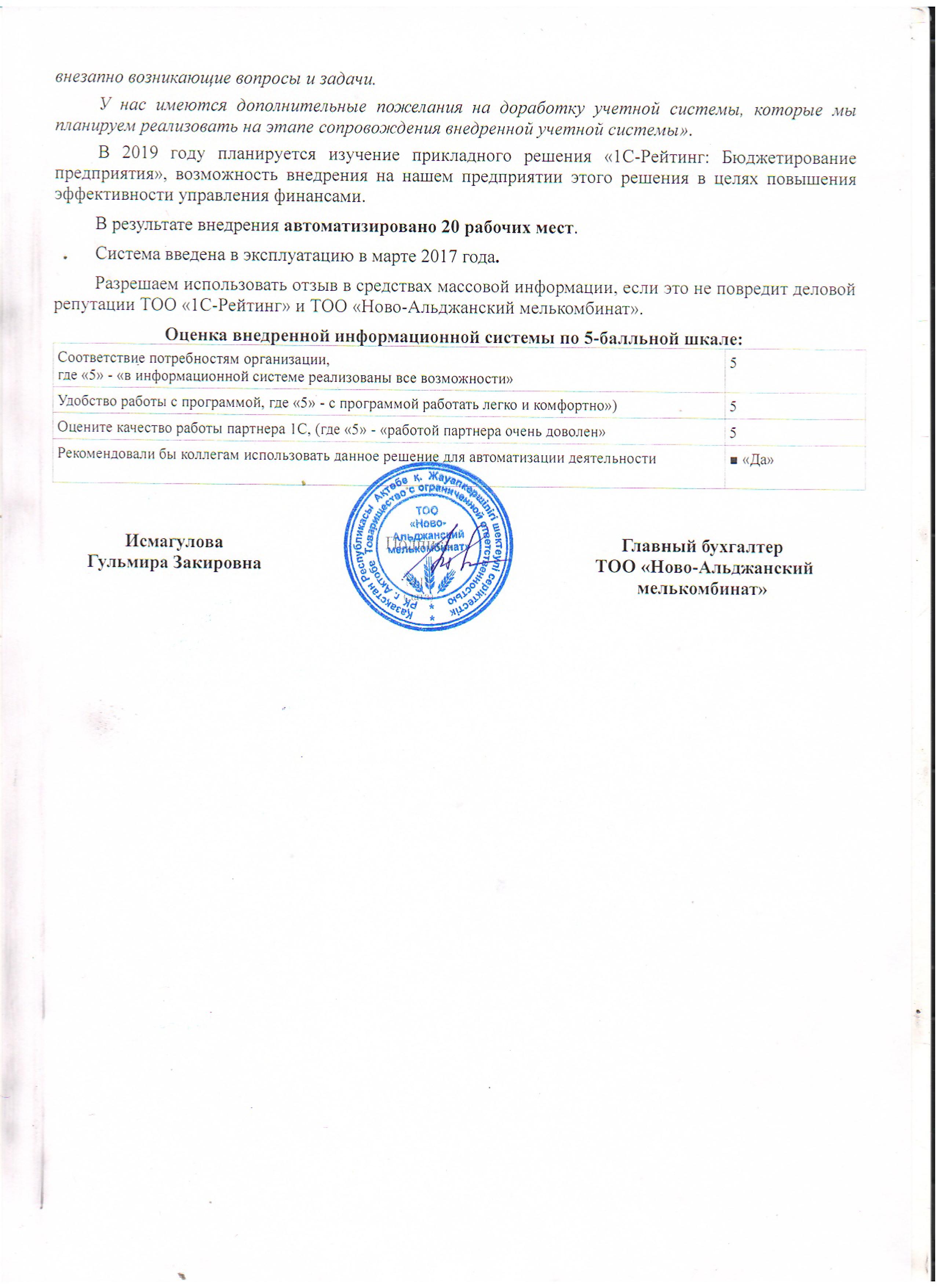 Специалисты ТОО «1С-Рейтинг» показали высокий профессионализм, продемонстрировали большой опыт работы в производственной отрасли, проявили отзывчивость и быструю реакцию на внезапно возникающие вопросы и задачи.