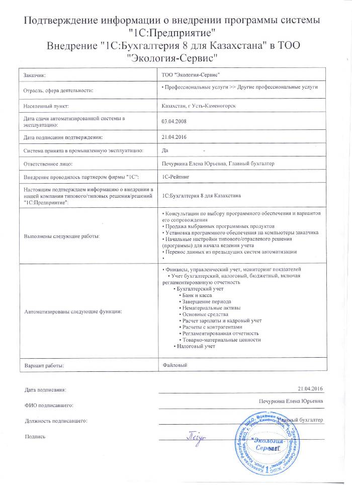 | Внедренное типовое решение: | 1С:Бухгалтерия 8 для Казахстана |