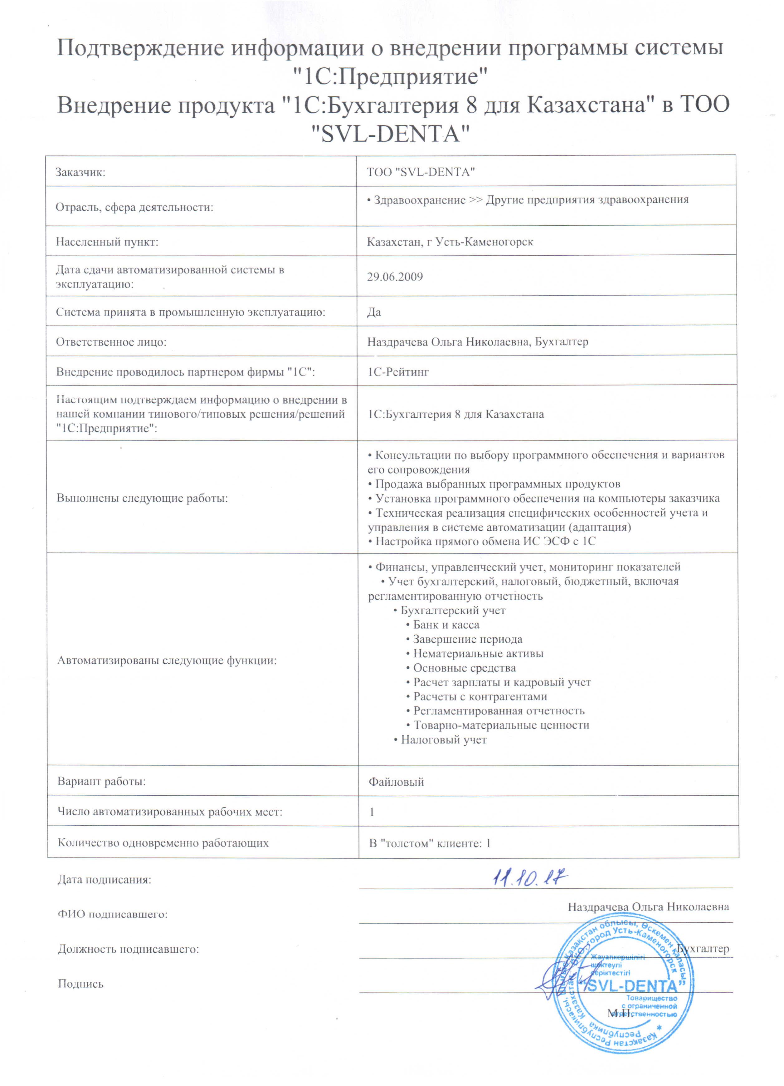 | Внедренное типовое решение: | 1С:Бухгалтерия 8 для Казахстана |