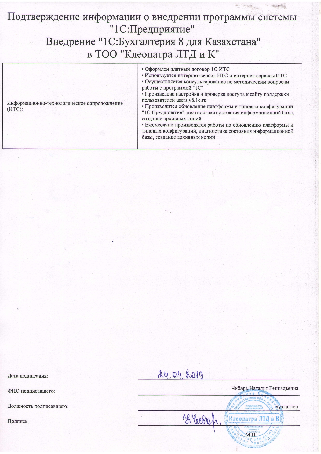 | Внедренное типовое решение: | 1С:Бухгалтерия 8 для Казахстана |