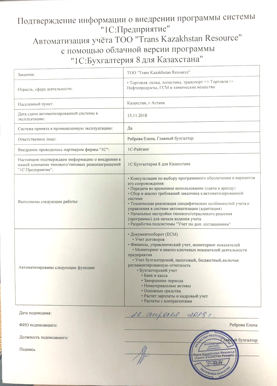 | Арендованное типовое решение: | 1С:Бухгалтерия для Казахстана |