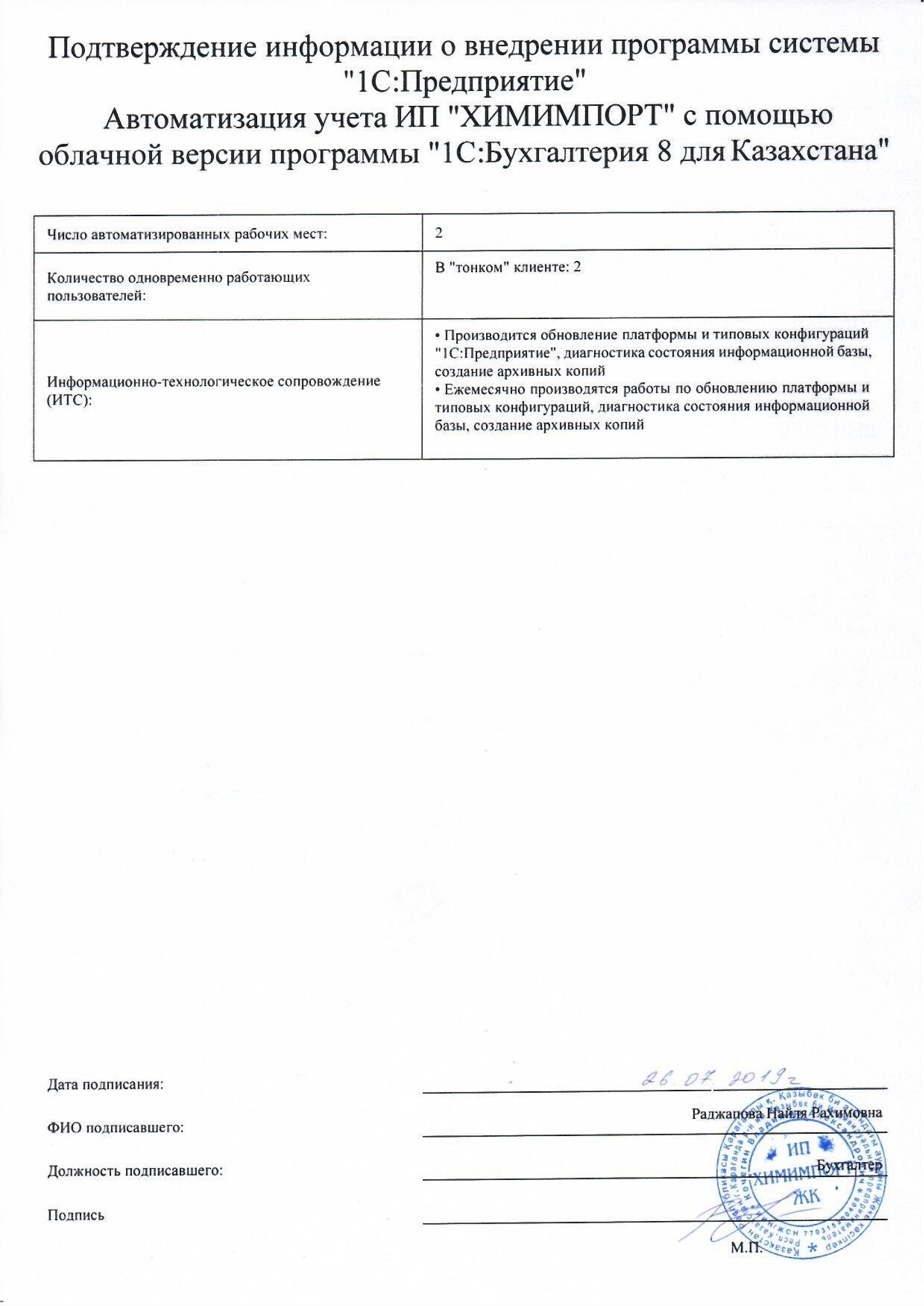 | Арендованное типовое решение: | 1С:Бухгалтерия для Казахстана |