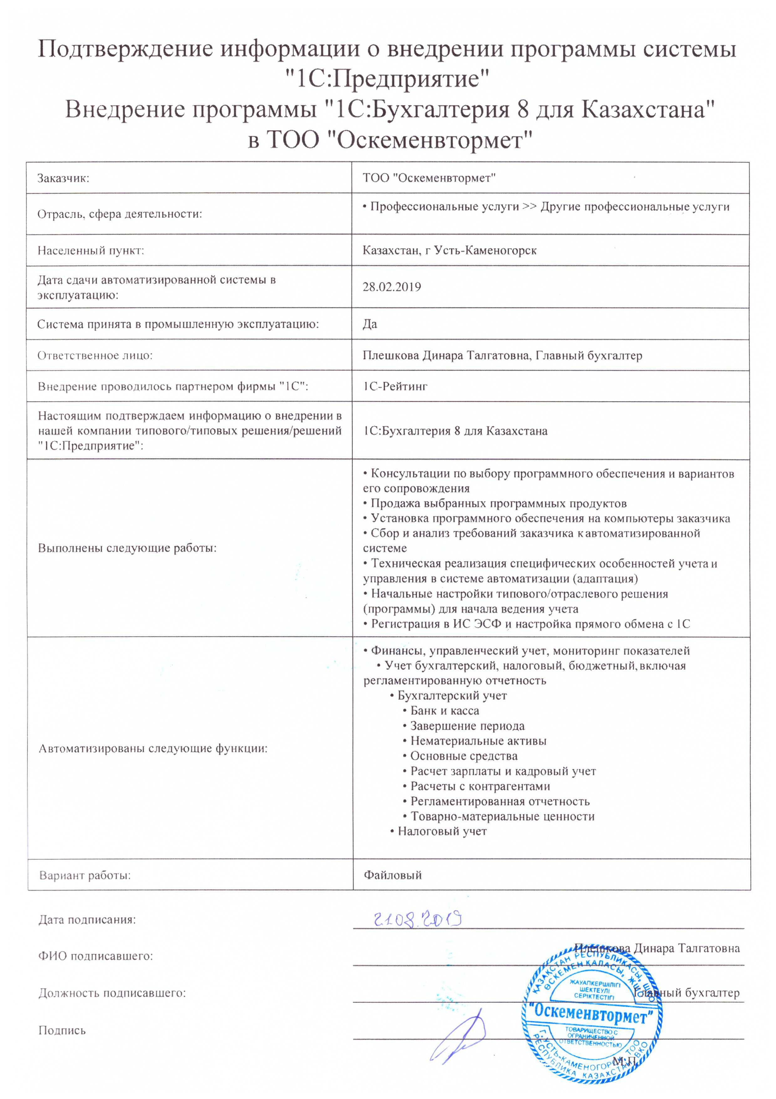 | Внедренное типовое решение: | 1С:Бухгалтерия 8 для Казахстана |
