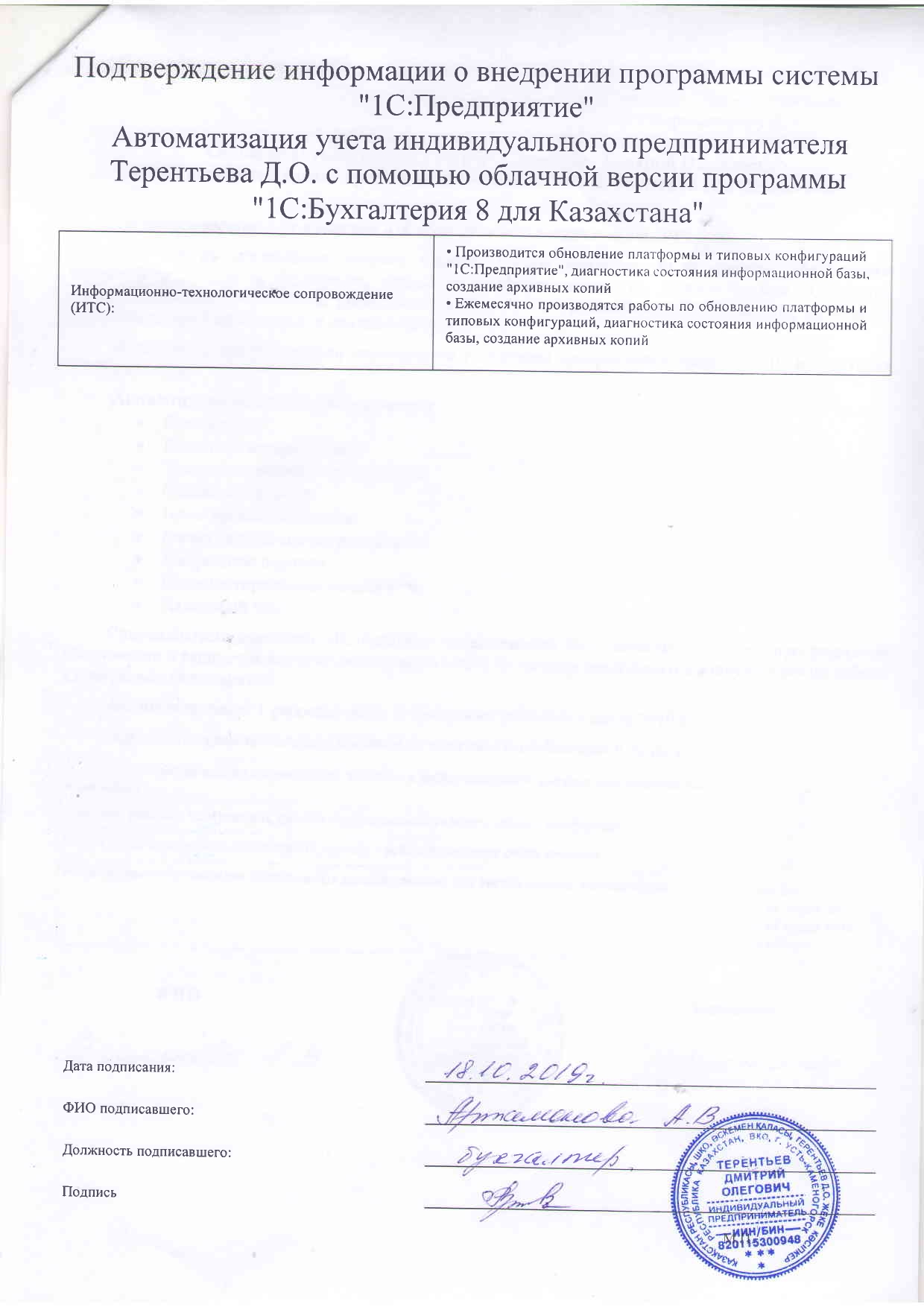 - Ежемесячно производятся работы по обновлению платформы и типовых конфигураций, диагностика состояния информационной базы, создание архивных копий