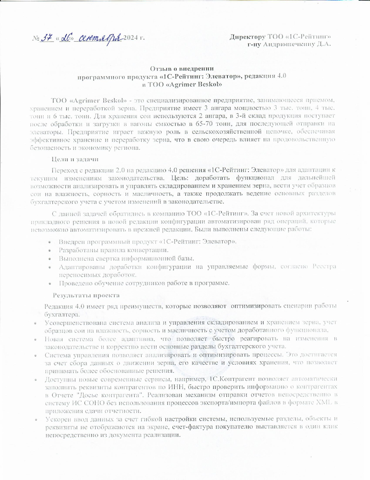 Переход с редакции 2.0 на редакцию 4.0 решения «1С-Рейтинг: Элеватор» для адаптации к текущим изменениям законодательства. Цель: доработать функционал для дальнейшей возможности анализировать и управлять складированием и хранением зерна, вести учет образцов сои на влажность, сорность и масличность, а также продолжать ведение основных разделов бухгалтерского учета с учетом изменений в законодательстве.