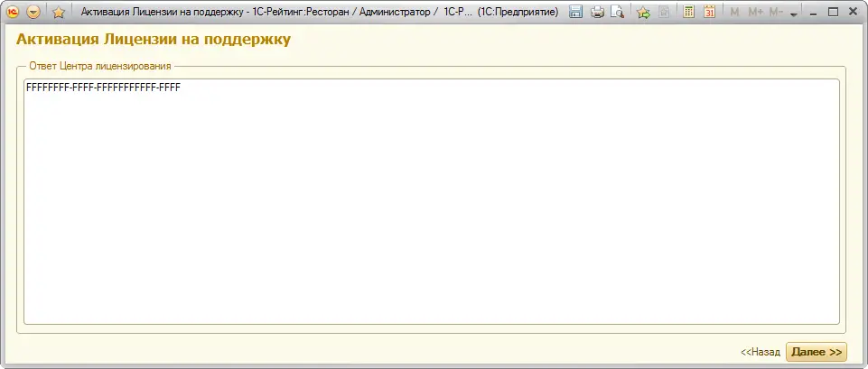На следующем шаге следует ввести ответ из Центра лицензирования, полученный при активации другой информационной базы в поле «Ответ Центра лицензирования».