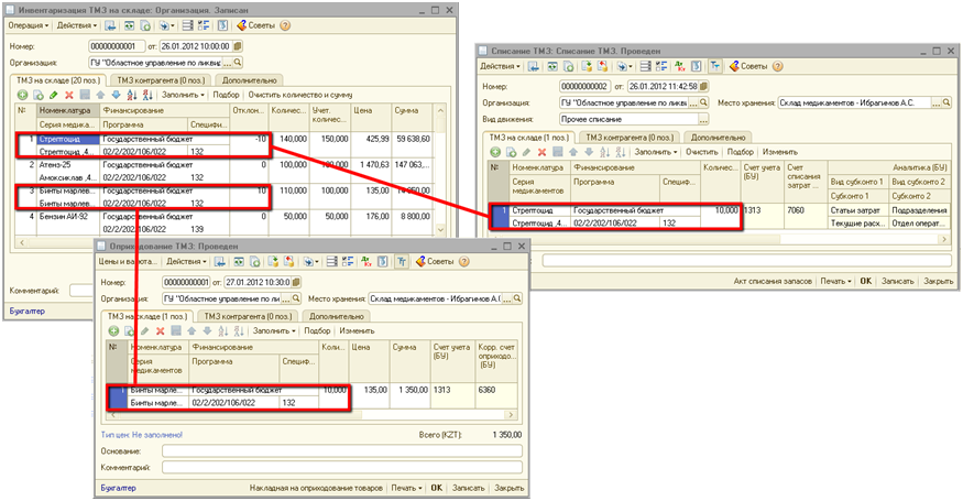 В программе «Госсектор: Бухгалтерия государственного учреждения для Казахстана» предусмотрено формирование инвентаризационных описей (сличительных ведомостей) по форме 401 и регистрация результатов инвентаризации с помощью специализированных документов. Это позволяет хранить в программе всю информацию о проведенных инвентаризациях. На основании документов, в которых зафиксировано расхождение фактических данных с учетными, можно ввести приходные документы – для оприходования излишков и расходные документы – для регистрации недостач.