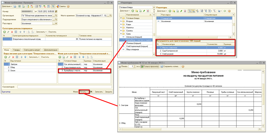 В подсистеме предусмотрены операции по составлению меню на каждый день, отражение поступления продуктов питания в разрезе поставщиков и договоров и списание продуктов питания по меню-требованиям в соответствии с нормами расхода. Списание продуктов питания осуществляется в разрезе категорий довольствующихся, источников финансирования и классификации расходов.
