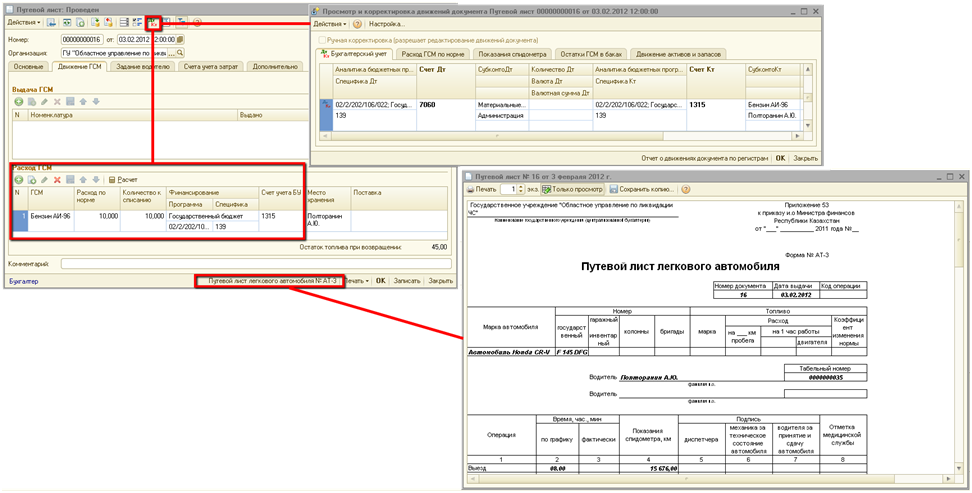 В конфигурацию включена подсистема «Учет ГСМ», которая предоставляет возможности оформления путевых листов транспортных средств (формы АТ-3, 462), расчета норм расхода горюче-смазочных материалов по произвольным формулам и списания ГСМ по данным путевых листов.