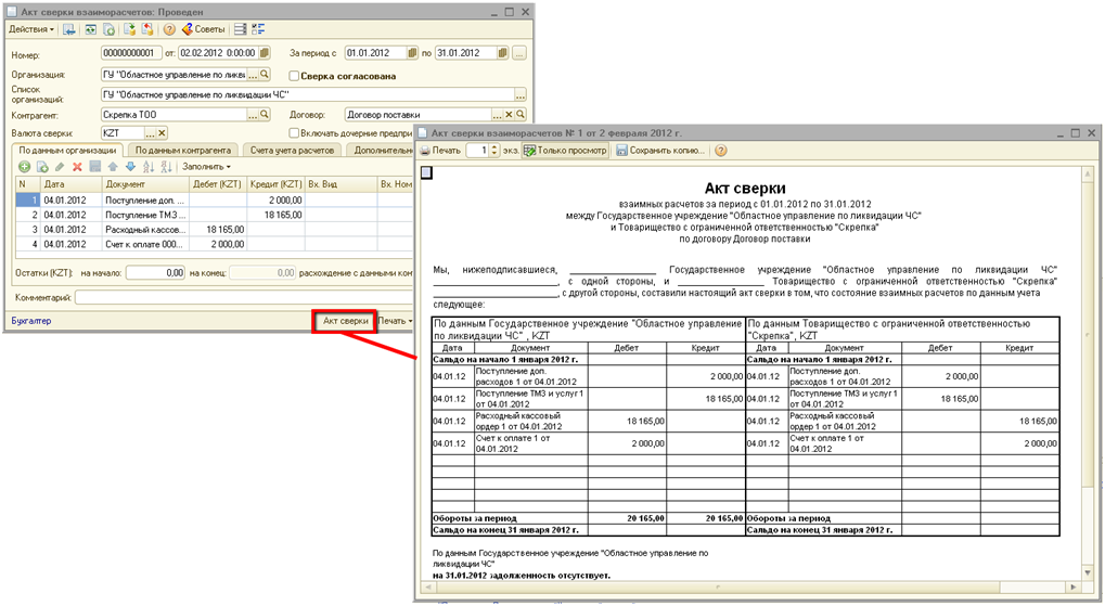 В конфигурации предусмотрен автоматический зачет авансов при проведении первичных документов, возможность корректировки долга, проведение взаимозачетов и формирование актов сверки взаиморасчетов.
