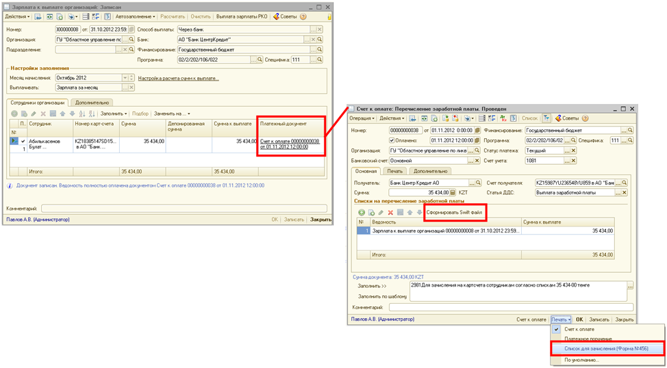 В конфигурации реализована возможность формирования платежных ведомостей на перечисление заработной платы, пенсионных взносов и социальных отчислений, формирование Swift-файлов и списков для зачисления. Перечисление производится в разрезе статей бюджетной классификации. Также реализована возможность регистрации исполнительных листов и перечисление сумм по исполнительным листам.