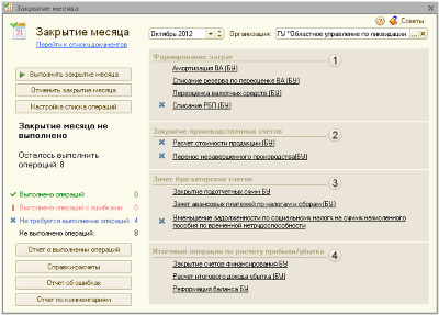 Помощник закрытия месяца представляет собой обработку, с помощью которой можно проанализировать какие операции необходимо выполнить в конце отчетного периода, а также осуществить контроль их выполнения с помощью специализированных отчетов.