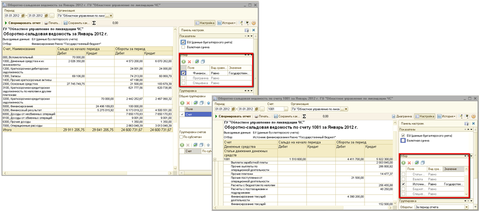Стандартные и специализированные отчеты имеют широкие возможности группировки, отбора, сортировки данных, оформления и т.д., позволяют оперативно получать необходимые регистры учета и представлять бухгалтерскую информацию в удобном для анализа виде, в том числе в разрезе статей бюджетной классификации.
