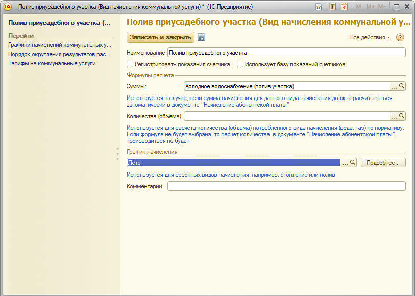 Для каждого вида начисления в прикладном решении предусмотрен выбор годового графика использования. Если график был установлен для вида начисления, то данная услуга будет автоматически заполняться в документе начисления при условии действия графика в период расчета (например, вид начисления «Полив участка» необходимо учитывать пять месяцев в году, с мая по сентябрь).