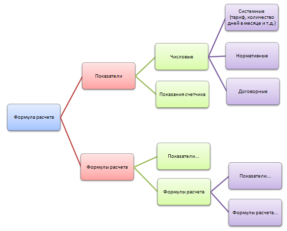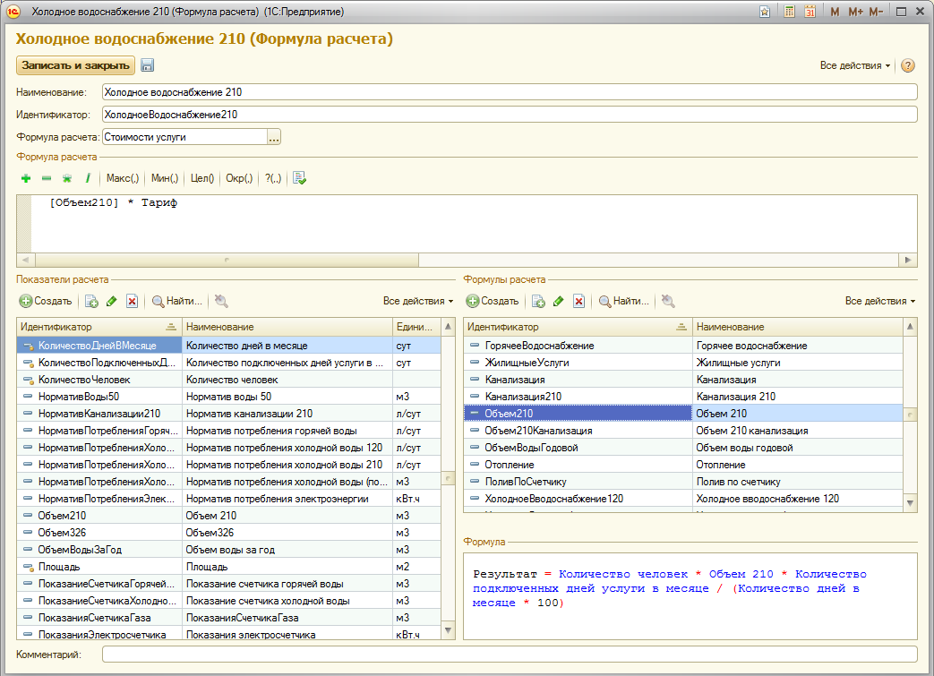 В прикладном решении реализован специализированный механизм формул расчета, который позволяет пользователям самостоятельно описать формулы расчета услуг. В описываемой формуле можно использовать все возможные показатели (договорные, нормативные, показания счетчика, системные показатели), а также неограниченное число вложенных формул. Использование вложенных формул позволяет декомпозировать формулу для обеспечения удобочитаемости и простоты ее понимания (например, в качестве вложенной формулы для расчета услуги холодного водоснабжения по норме может выступать формула расчета потребления воды в сутки из литров в кубические метры).