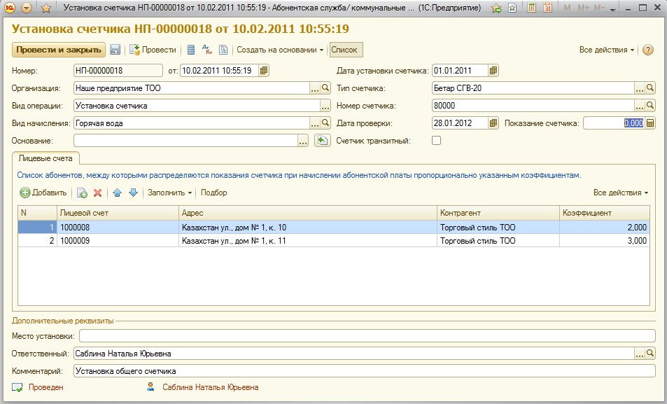 Предусмотрена возможность подключения счетчика ранее бывшего в эксплуатации с указанием текущего показания. Также возможно зарегистрировать подключения (отключения) абонентов к уже установленным счетчикам.