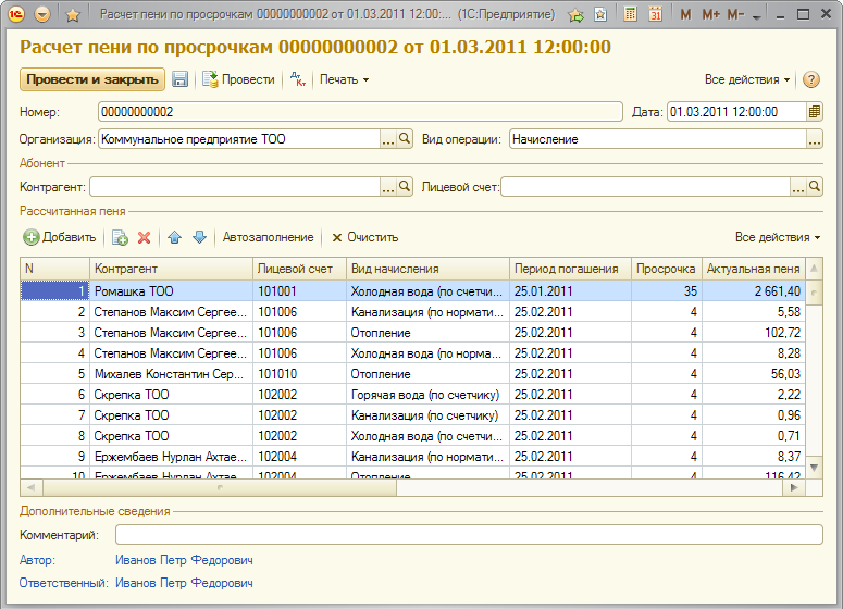 Пеня по просроченным выплатам может быть рассчитана динамически в момент оплаты долга абонентом или специальным документом. В целях выполнения анализа пени и отражения пени в бухгалтерском учете, в системе используется документ «Расчет пени по просрочкам».