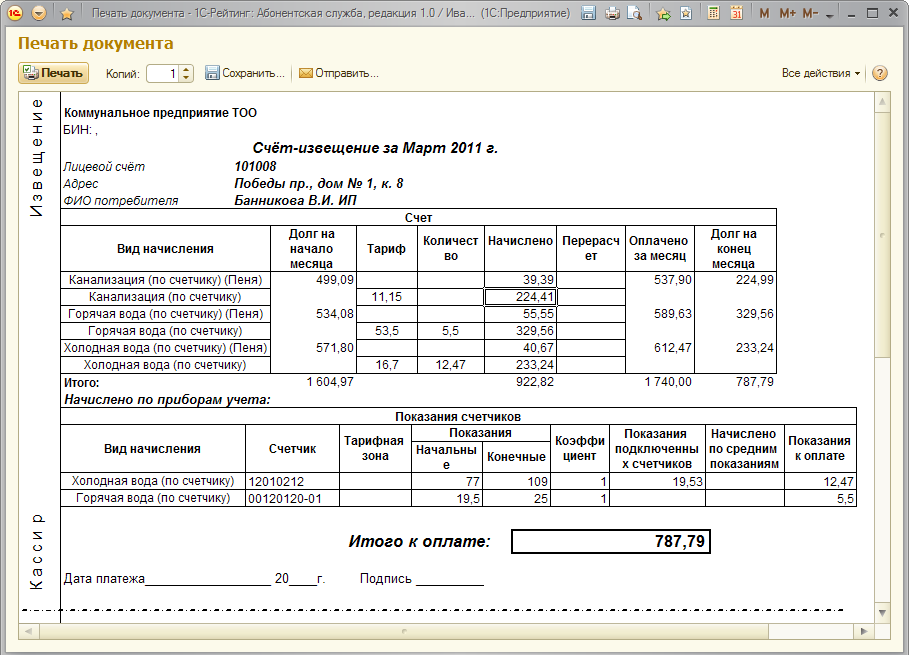 В прикладном решении реализован ряд универсальных отчетов, с помощью которых можно получить информацию о начислениях, оплате, задолженности, количестве подключенных счетчиков и прочих данных. В программе предусмотрена возможность печати квитанций о начислении за коммунальные услуги.