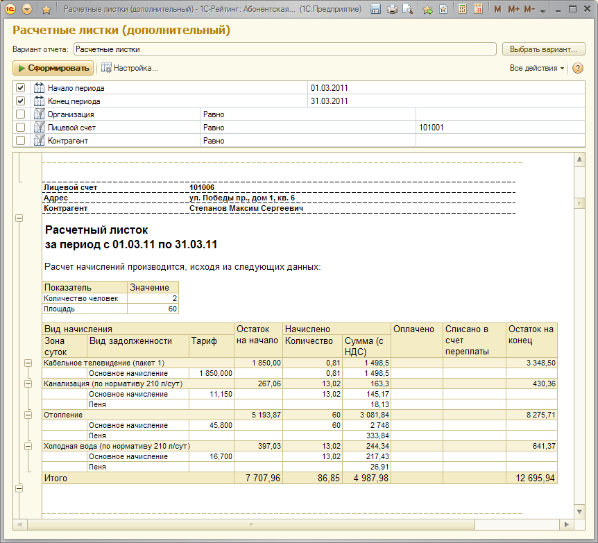 Отчет «Расчетные листки» позволяет формировать расчетные листки для абонентов за выбранный период с учетом ряда настроек.