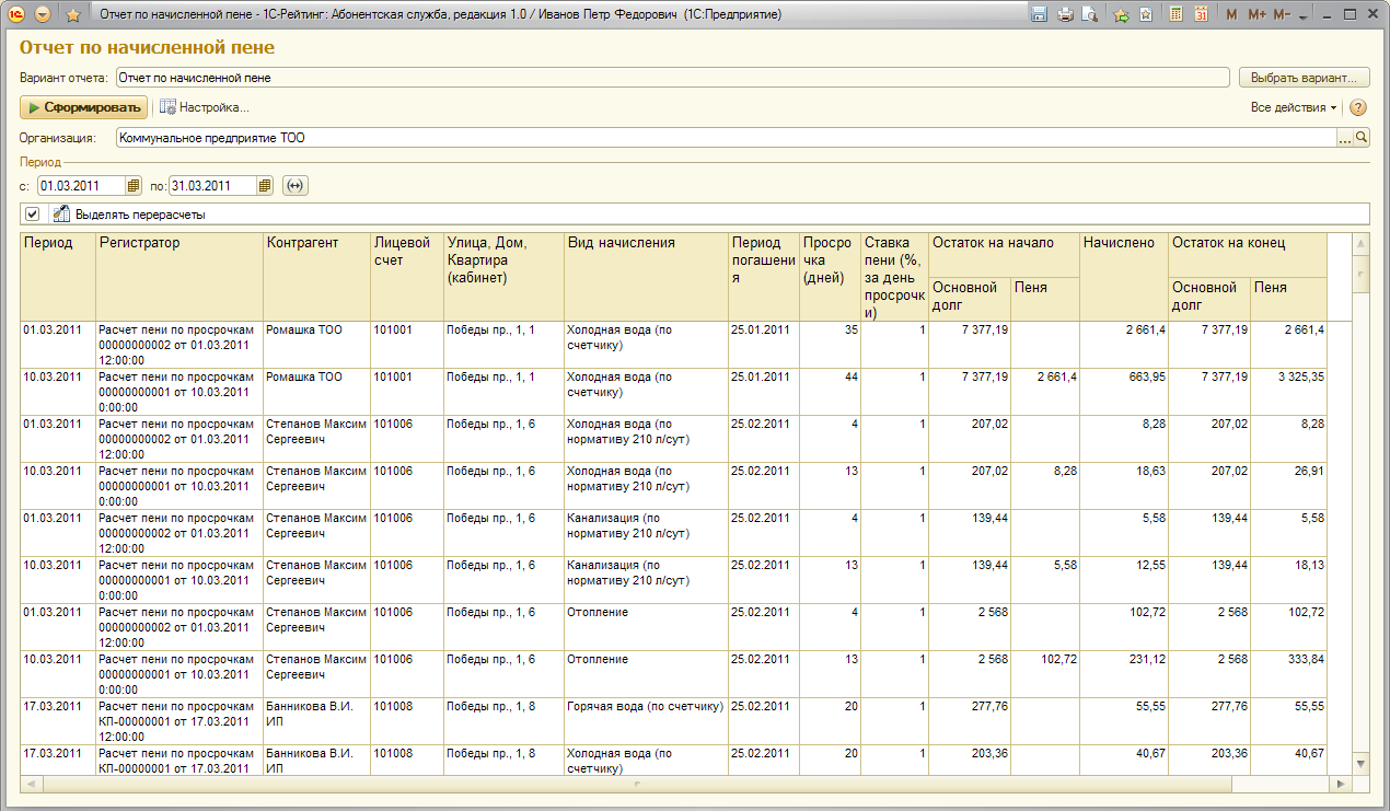 - предусмотрена возможность расчета пени по просроченным платежам по каждому виду начисления.