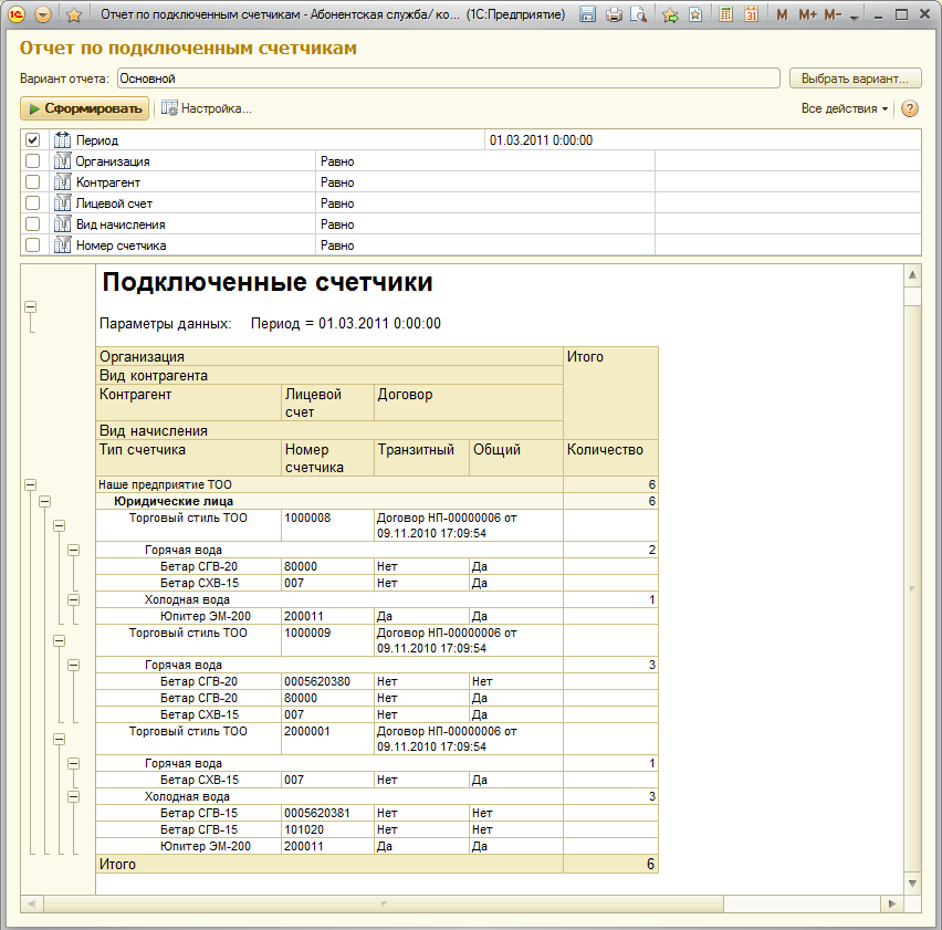 В прикладном решении предусмотрен учет транзитных и общих счетчиков, что позволяет гибко настроить правила расчета начисления абонентской платы. Счетчик может быть установлен для любого вида начисления (холодная вода, горячая вода, газ и т.д.). При этом на один вид начисления может быть установлено неограниченное количество счетчиков (например, несколько счетчиков холодной воды в одной квартире).
