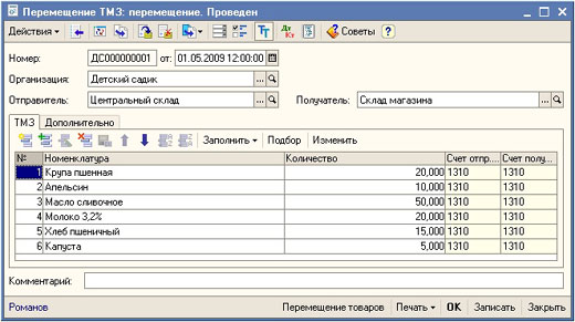 Для оформления операции перемещения продуктов питания между складами организации используется типовой документ Перемещение ТМЗ.