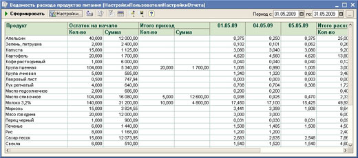 Документом формируются проводки по списанию продуктов питания со склада согласно нормам расхода (рецептурам) с учетом количества питающихся и состава готовых блюд меню;