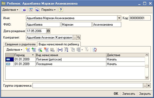 В подсистеме учета родительской оплаты предусмотрена возможность описания произвольного количества видов начислений за услуги, предоставляемые детским учреждением.