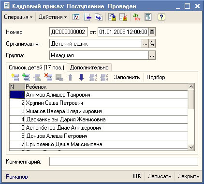 Операции по регистрации в информационной базе нового состояния (принят, выбыл) ребенка оформляются документом Кадровый приказ.