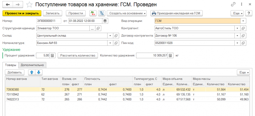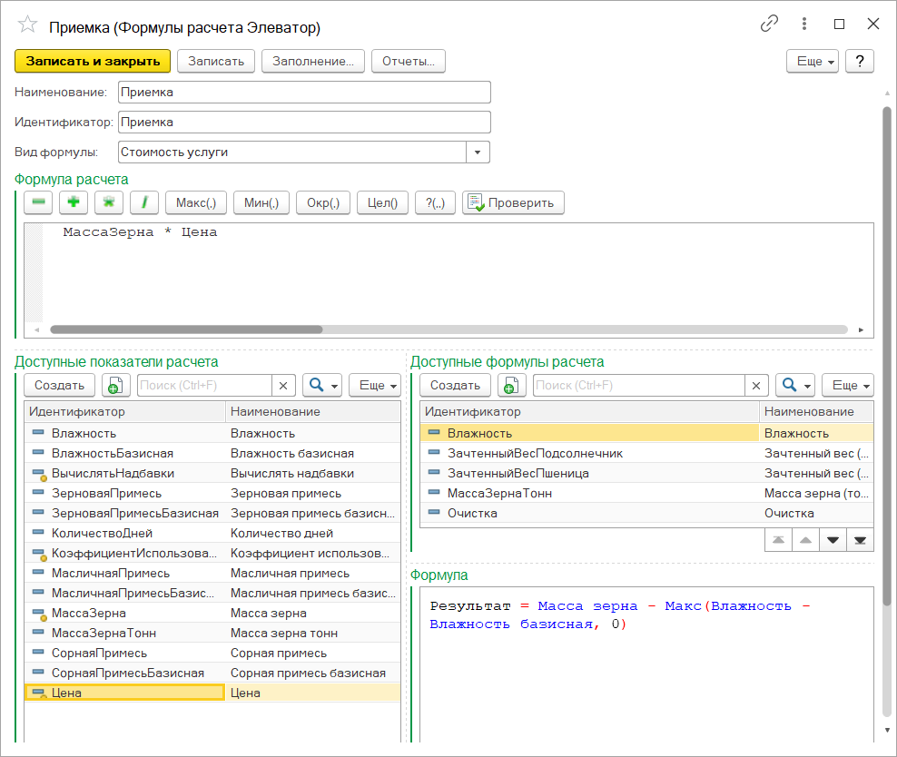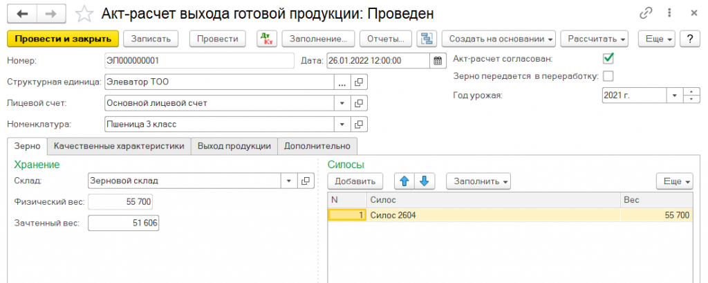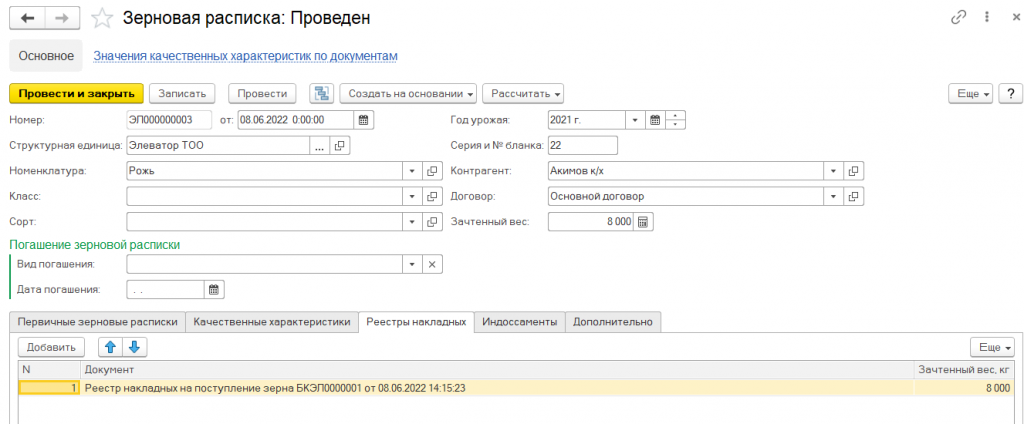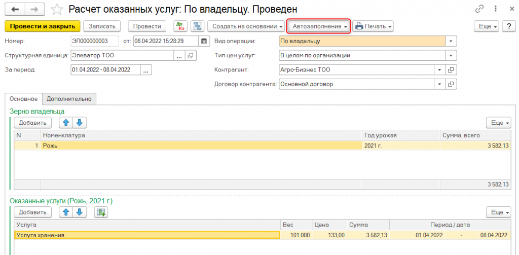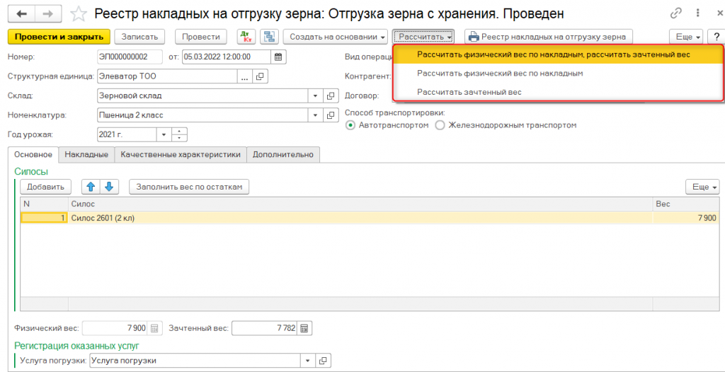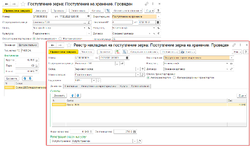 Помимо этого, предусмотрено выполнение предварительного расчета сумм услуг в реестре на поступление зерна.
