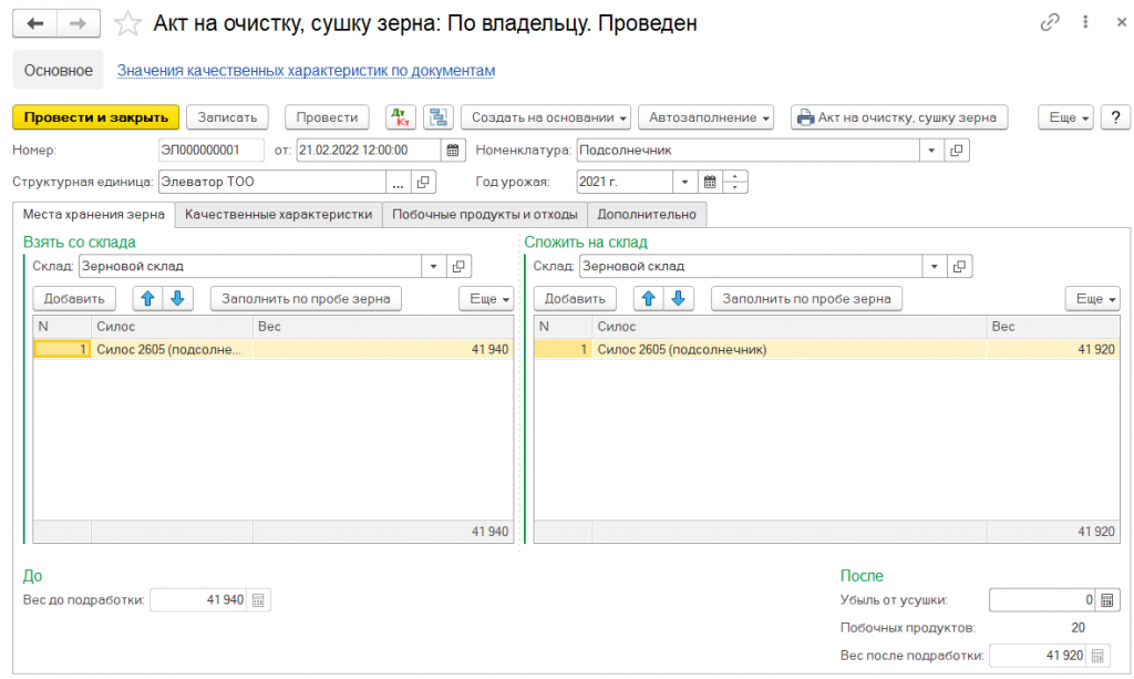 Результаты очистки, сушки зерна, а также оприходование побочных продуктов и отходов оформляются актом на очистку, сушку зерна.