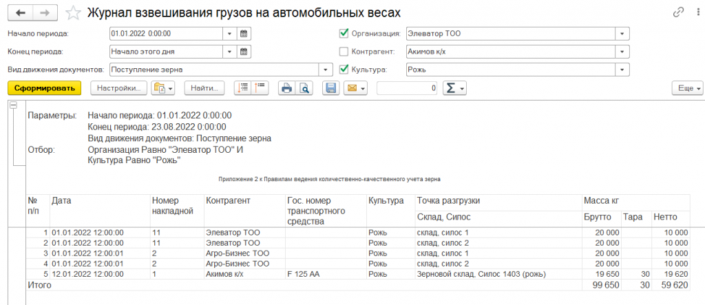 Произвести анализ данных поступившего и отгруженного зерна на автомобильных и железнодорожных весах можно с помощью отчетов «Журнал взвешивания грузов на автомобильных весах» и «Журнал взвешивания грузов на железнодорожных весах».