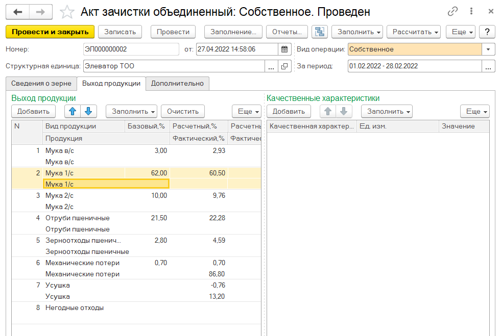 Предусмотрена возможность формирования специализированного расчета «Акт о зачистке производственных помещений», отражающего данные по количеству и средневзвешенному качеству переработанного зерна, по количеству и средневзвешенному качеству произведенной продукции за отчетный период.