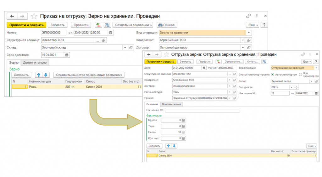 В случае отгрузки зерна с показателями качества отличными от договорных, в реестрах накладных на отгрузку предусмотрена возможность расчета количества отгружаемого зерна.