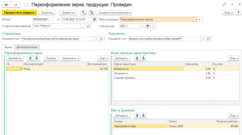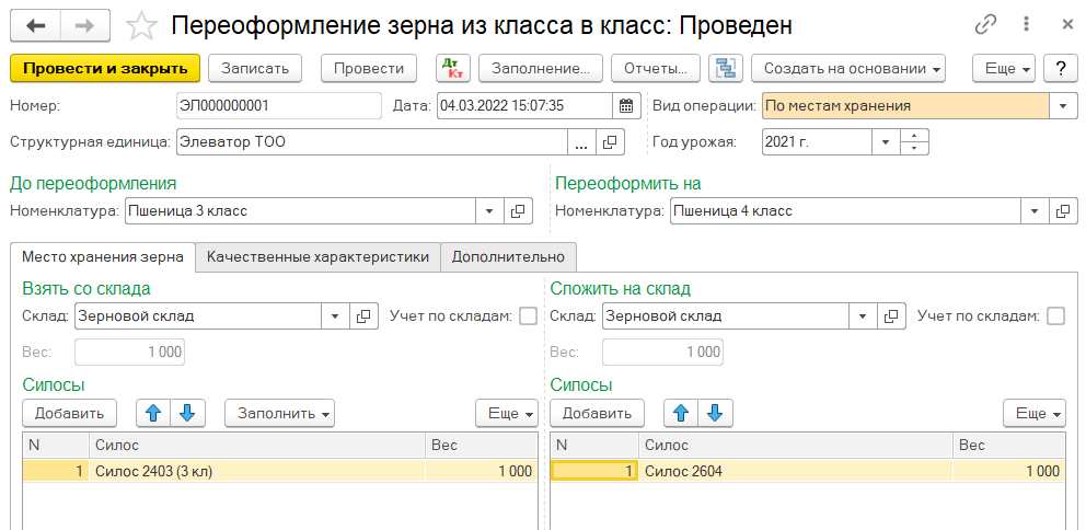 Для оформления операции по переоформлению зерна из класса в класс, с указанием качества зерна до и после переоформления, используется документ Переоформление зерна из класса в класс.