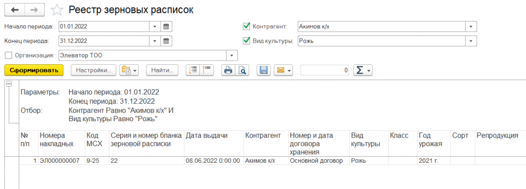 В отчете отражаются данные всех зерновых расписок, выдаваемых хлебоприемным предприятием при поступлении зерна на хранении, за период с возможностью определения отборов по контрагенту и культуре.