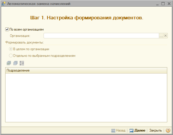 • Отдельно по выбранным подразделениям - документы будут сформированы отдельно на каждое выбранное подразделение организации.