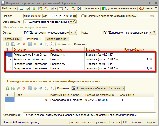 Завершает обработку нажатие кнопки «Выполнить», после которого в программе формируются документы «Кадровое перемещение организаций», прекращающие действие прежнего начисления и назначающие новое начисление. При успешном выполнении обработки выводится окно с надписью «Обработка данных завершена!».
